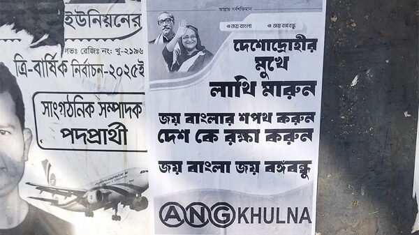 খুলনা মহানগরী ও পূর্ব রূপসা এলাকায় এখন বিভিন্ন স্থানে পোস্টার দেখা যাচ্ছে, যেখানে আঁকা হয়েছে বাংলাদেশের বিরুদ্ধে গলা তোড়া ভাষা এবং আওয়ামী লীগের অশুভ স্লোগান। এসব পোস্টারে লেখা রয়েছে, ‘দেশদ্রোহীর