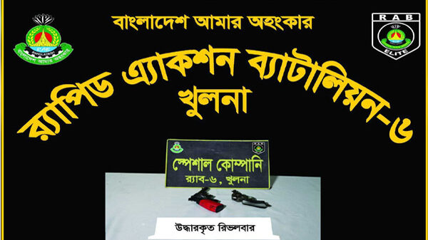 র্যাব-৬ খুলনার রূপসা থানা এলাকায় বিশেষ অভিযান চালিয়ে পরিত্যক্ত অবস্থায় দুইটি রিভলবার উদ্ধার করেছে। র্যাবের প্রেস বিজ্ঞপ্তিতে বুধবার (২৭ জানুয়ারি) এ তথ্য জানানো হয়। প্রেস বিজ্ঞপ্তি অনুযায়ী, গোপন সংবাদের ভিত্তিতে