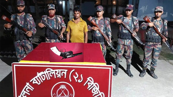 যশোরের শার্শা উপজেলার বেনাপোল সীমান্তে অভিযানে বিজিবি ধান রাখার গোলাঘর থেকে একটি দেশি পিস্তল উদ্ধার করেছে। এ সময় একজন ব্যক্তিকে গ্রেফতার করা হয়েছে। ঘটনাটি ঘটেছে মঙ্গলবার ভোরের দিকে, যখন খুলনা